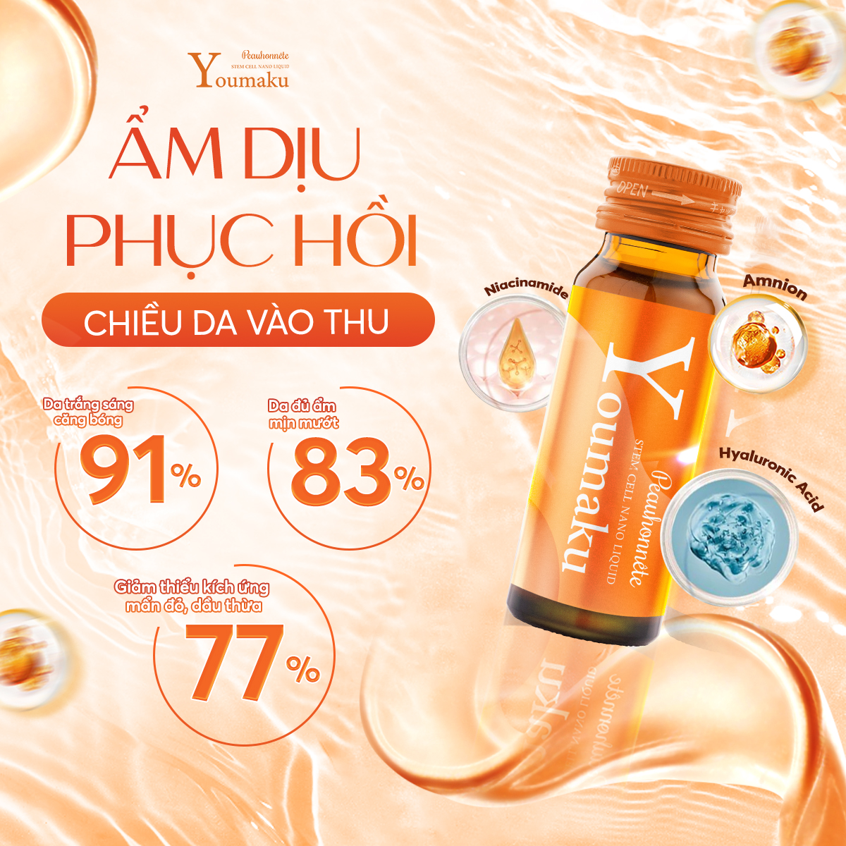 2.2. Làm trắng toàn thân:Khác với các sản phẩm bôi chuyên biệt từng bề mặt da, thức uống Youmaku lại có tác dụng toàn diện từ sâu bên trong. Màng ối Amnion và chiết xuất HIF-1 Stem kích thích sản sinh tế bào da mới và tái tạo làn da trẻ trung. Glutathione ức chế hoạt động của hắc tố melanin, làm mờ vết thâm, tàn nhang và làm trắng da toàn thân. 2.3. Hiệu quả lâu dài:Youmaku không mang lại hiệu quả trắng da tức thì nhưng đảm bảo kết quả lâu dài và lành tính. Youmaku chứa những thành phần lành tính, an toàn cho làn da tác động lên làn da một cách từ từ, chuyên sâu và toàn diện. Bạn nên sử dụng Youmaku đều đặn 1 lọ mỗi ngày trong 1 tháng để thấy rõ hiệu quả của sản phẩm.